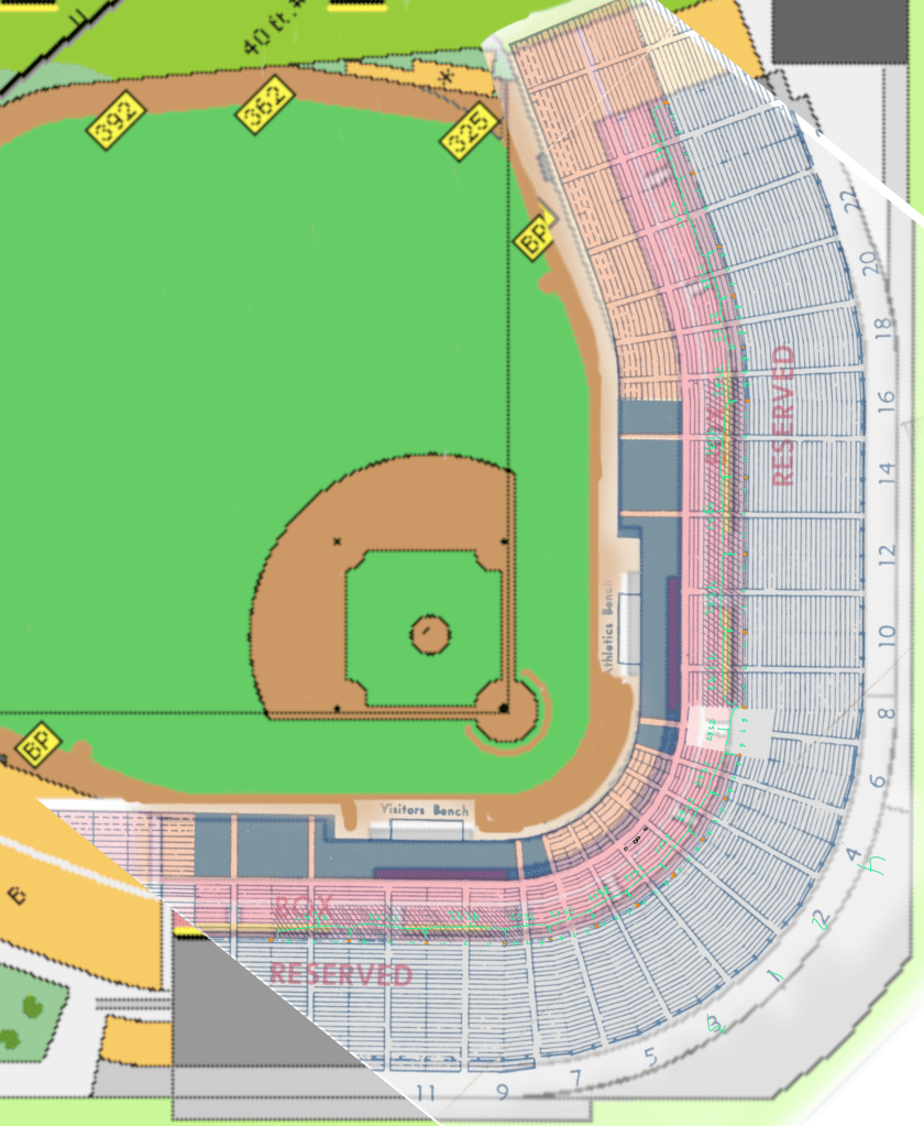 With a seat completed, I started building rows and could start importing them into my stadium. However, I still didn’t have all the correct numbers of seats per section/row, so my search for a seating chart continued and I started contacting more people. My first email was to someone at Osborn Engineering, the people who had originally built the stadium in 1923. They didn’t answer. I later found out the 1955 renovation was done by someone else, so even if they had some blueprints it probably would have been different than what I was looking for. I contacted some folks at SABR, and Ron Selter and Kevin Johnson of the SABR ballpark committee sent me over everything they had on the stadium. Some great info, but nothing in terms of a seating chart. I contacted some museums and even sent something to the Royals, who used the stadium for 4 seasons after the A’s left and before Kauffman Stadium was built. Not more than a few hours after my email to someone at the Royals I got a lengthy response from Curt Nelson, Director of the Royals Hall of Fame. Like Ron and Kevin, Curt was excited about my project. He pointed me in the direction of some museums, and mentioned the Royals had been in talks with Populous about a KC Municipal Stadium model but it never came to fruition. Along with some info and further places to research, Curt sent me this awesome seating chart from the first meeting of the Royal Lancers, a group of businessmen who formed the Royals first season ticket sales force. The seating chart still says “Athletics” by the dugouts while the handwritten header says “Royals”. This, and a few other similar seating charts I had found helped me figure out how many sections and rows there were and the numbers of each of those sections. Still, no one seemed to have a chart complete with individual seats.