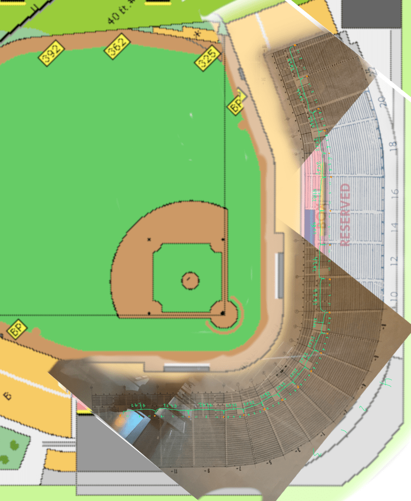 After lining them up I ended up redoing a lot of the work I had previously done… I fixed up angles, moved the poles the correct distances from each other, and plotted out the sections. I built the rest of the stands and I placed rows of seats and copied seats and placed more rows of seats and copied seats and…. Well here is what the stands of my model looked like after I got the chart I needed. If not perfectly accurate, quite close.