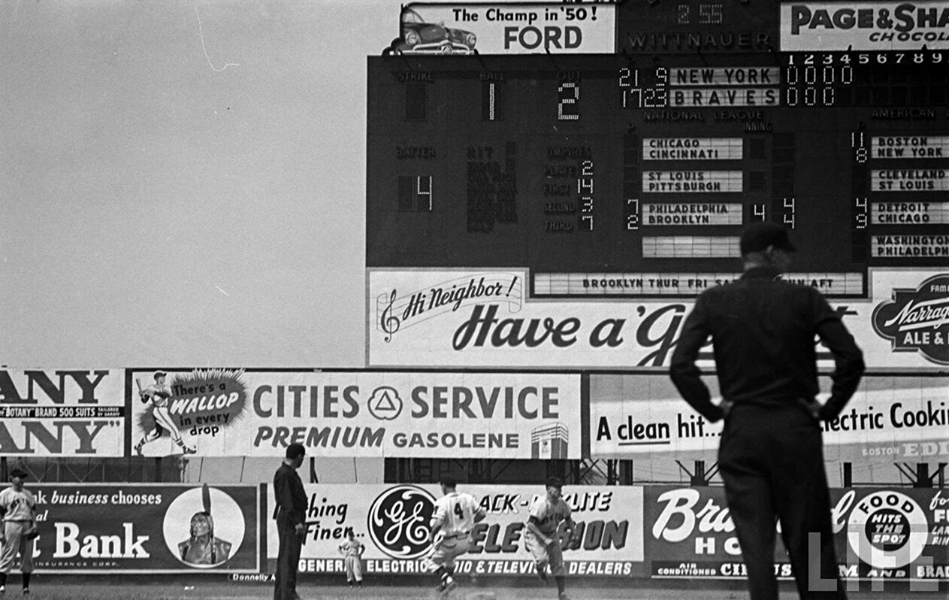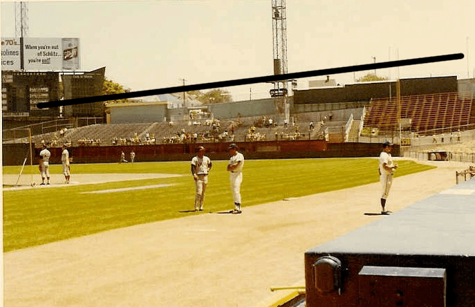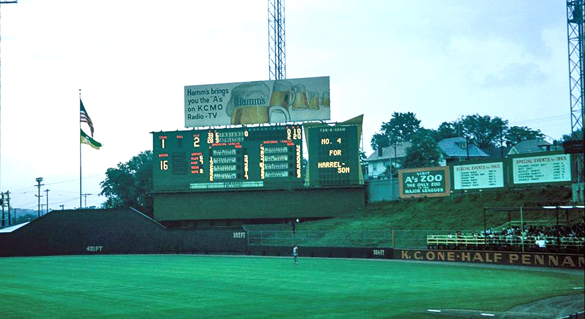The stands are a big part of the stadium, but certainly not the only important aspect. Another important and distinct thing is the centerfield scoreboard. The scoreboard resided in KC Municipal Stadium from the 1955 reconstruction through the 1976 demolition. Before moving to Kansas City it was at Braves Field in Boston, and like other parts of the stadium it had some changes over the years. These changes include additions to the paneling on the left to accommodate putting up football scores for Chiefs games, and an extension to the right of the board which housed the Fan-A-Gram or Fan-R-Gram.