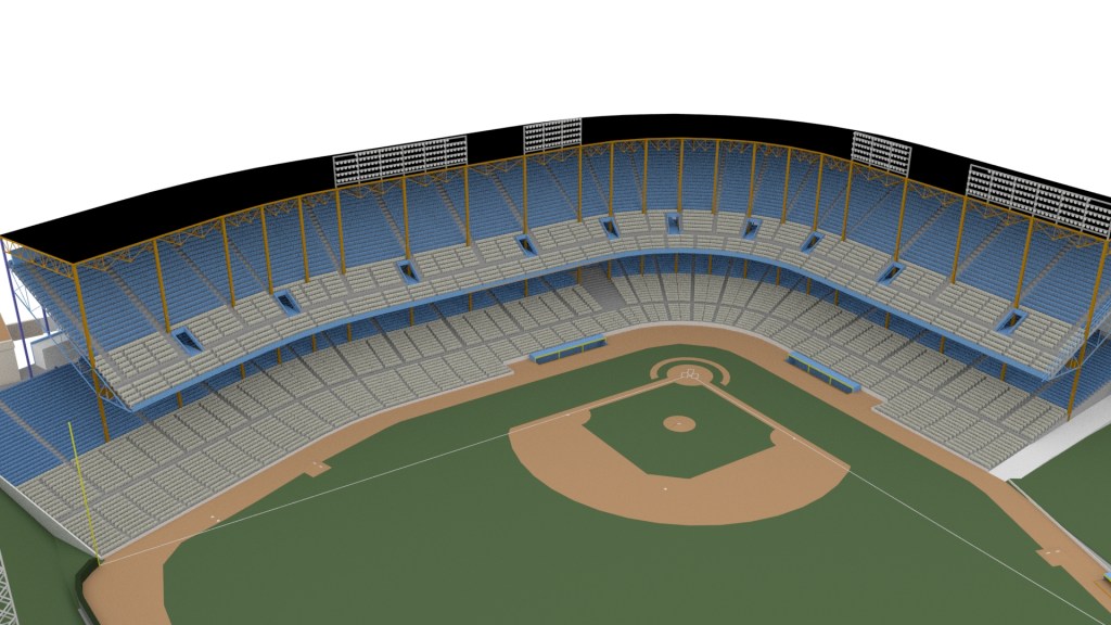 To start modeling, I used Andrew Clem’s website to make the footprint of the stadium. As helpful as the diagram was, it didn’t provide me with all the information I was going to need. I started looking at every photo that popped up when I searched “Kansas City Municipal Stadium” in Google, and Getty Images, and the Kansas City Public Library. I watched some YouTube videos and was able to gain some information, such as roof height and outfield light height, thanks to this podcast. With these resources and some educated guessing, my structure was looking like it actually resembled the stadium!